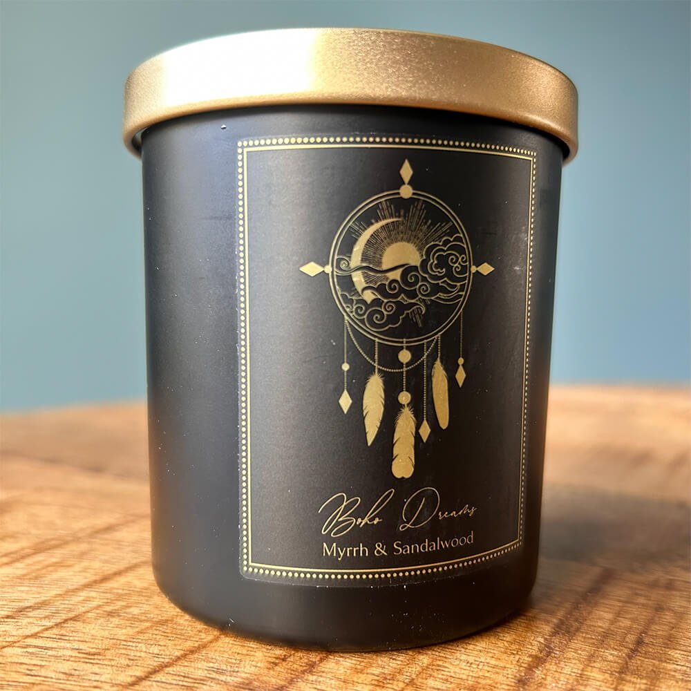 Channel your intentions and elevate your space with the Boho Dreams Manifestation Candle, a soulful blend of ritual and relaxation. Hand-poured into a lustrous glass jar, this soy and palm wax candle is infused with the calming scent of myrrh and sandalwood, creating a grounded, boho atmosphere ideal for meditation, journaling, or simply unwinding.