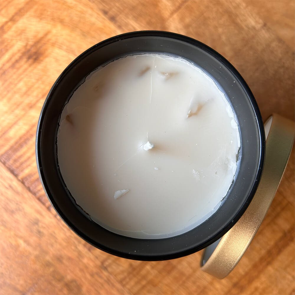 Hand-poured from soy & palm wax. With essential oils and gemstones.