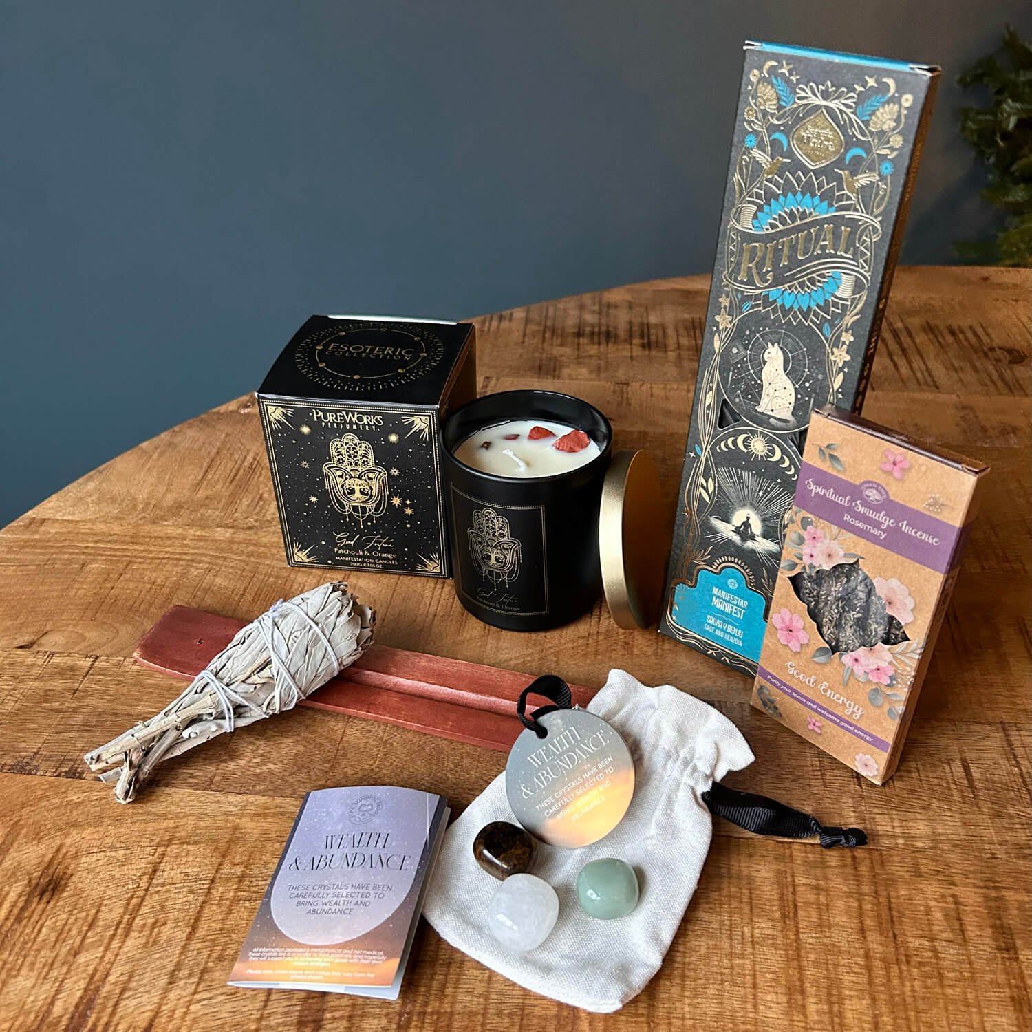 The sage and rosemary tools clear stagnant or limiting energy, while the manifest incense strengthens your intentions and focus. The patchouli and orange candle lifts your vibration, helping you step into an abundant mindset. The crystal trio works together to boost motivation, attract luck and amplify your manifestation energy. Combined, these elements open the way for prosperity, new opportunities and positive forward movement.